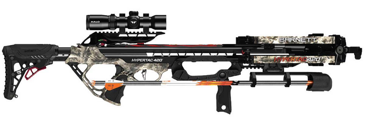 The Barnett HyperTac 420 is shipped fully assembled in double-encased durable cardboard packaging and is available in Mossy Oak Elements Terra Gila camo. It incorporates a patented integrated string hook system, pre-installed string stop dampeners, micro-adjustable length-of- pull butt stock, and cheek piece, stock integrated crank cocking device with push button handle release, CNC machined aluminum flight track, soft-loc floating bristle arrow retainer, anti-dry fire Triggertech trigger system, and is topped off with a premium 1.5-5×32 illuminated, speed compensating, multi-circled reticle scope, 3-arrow instant detachable quiver, three HyperFlite small diameter arrows with 100-grain field points. The crossbow is ready to shoot right out of the box.
