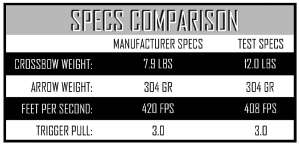 I always stress the difference between the advertised specs of an individual cross- bow and its actual “hunt setup” specs. Most of the time manufacturers market bare bow specs which can be misleading. In extremely rare cases, the advertised weight and speed of the crossbow are its true weight and speed when set up in full hunt dress. Because of this, a side-by-side comparison test is completed against the crossbow’s marketed specs.