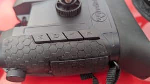 In use, the binoculars were easy to handle. Adjusting focus with the diopter allowed for a sharp image tailored to individual eyesight. The top-mounted buttons were easy enough to manage for switching modes (day/night), adjusting IR level intensity, zooming, recording and playback. The menu allows for date/time settings and screen brightness settings. The IP65 rating held up to the dusty ATV rides and trails I used, giving confidence in typical outdoor conditions; however, I didn’t have a chance to use them in the rain.