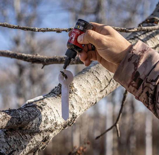To activate the mock scrape, I often use Wildlife Research Centers Golden Scrape inside of my scent dripper. The design allows for a slow drip for an extended period, keeping the scrape fresh for longer. When using a scent wick, I like to use a spray lure (such as Raw Frozen Scents Scrape Lure) on the ground along with one of their Big Wicks. The wick allows the scent to carry a strong odor downwind, reaching any bucks who are cruising the area so they can smell it and investigate. Another great way to broadcast to a wide scent area is by spraying an aerosol-style scent (like Buck Bomb’s Scrape Generator). The scent can be sprayed on the ground, trees, limbs and other objects to keep a strong scent in the air for a longer time.