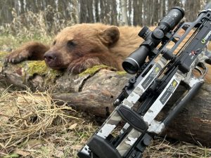 A beautiful blonde color-phase black bear emerged through the trees, and my heart rate immediately started to climb. The excitement was intense, and I reminded myself not to hold my breath. The large bruin was cautious and coy but eventually sauntered into the open. The thick fur rippled with every step of the rotund bruin as it walked toward my stand. Showing restraint, I waited for a broadside shot, not wanting to take any chances. At 24 yards, the bear took a few steps sideways and offered a slight quartering-away shot. The green, illuminated reticle of the scope on my TenPoint TX440 found the vitals. A gentle squeeze of the trigger ended with a loud smack of my arrow penetrating the bear and breaking the far shoulder.