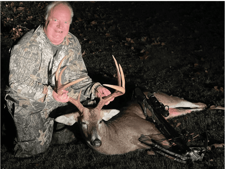 I tried to get the crosshairs of my scope on his chest, but he continued walking until he was out of my desired shooting range. I didn’t get him but it was nice to see that the deer in this area were not spooky and they moved around during daylight hours. That was the main event for the day, so now I would have to see what tomorrow would bring. The next day was much the same. I settled in on a nice, pleasant evening. It took a couple of hours of sitting as I had to wait until dusk for some developments. Right at dusk a doe and her yearling walked in right between the two walnut trees and were grazing right in front of me. The daylight was sinking fast, and I only had 7 minutes of legal shooting light. Just then another deer appeared behind the first two, and I could see the nice-sized antlers glowing in the twilight. This was a bigger buck that I did not have any pictures of. He stopped and put his head down behind the big doe, and I put my lighted crosshair right behind his front leg. The broadhead made a loud “slap” when it struck him, and he ran as hard as he could out into the darkness of the field.